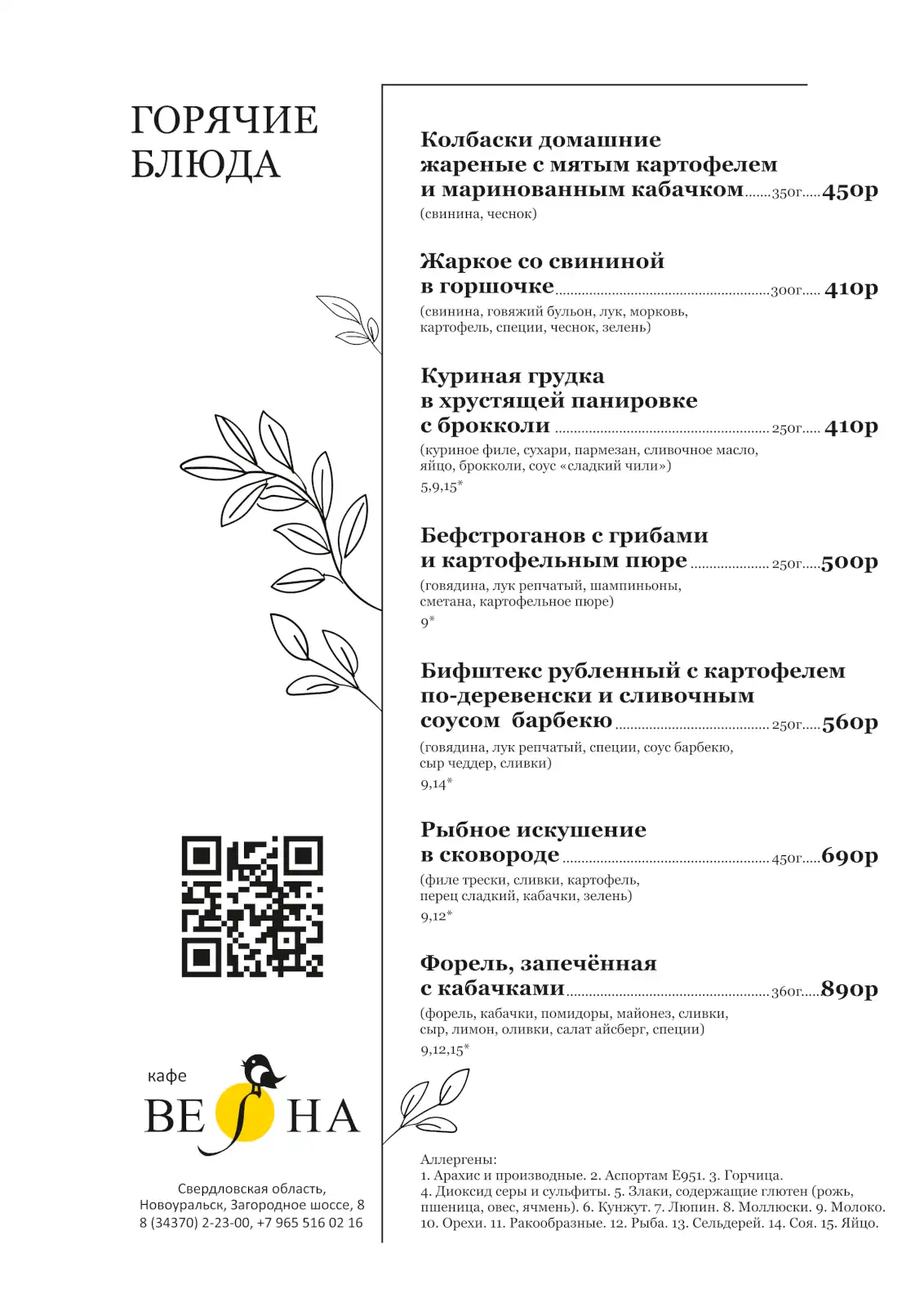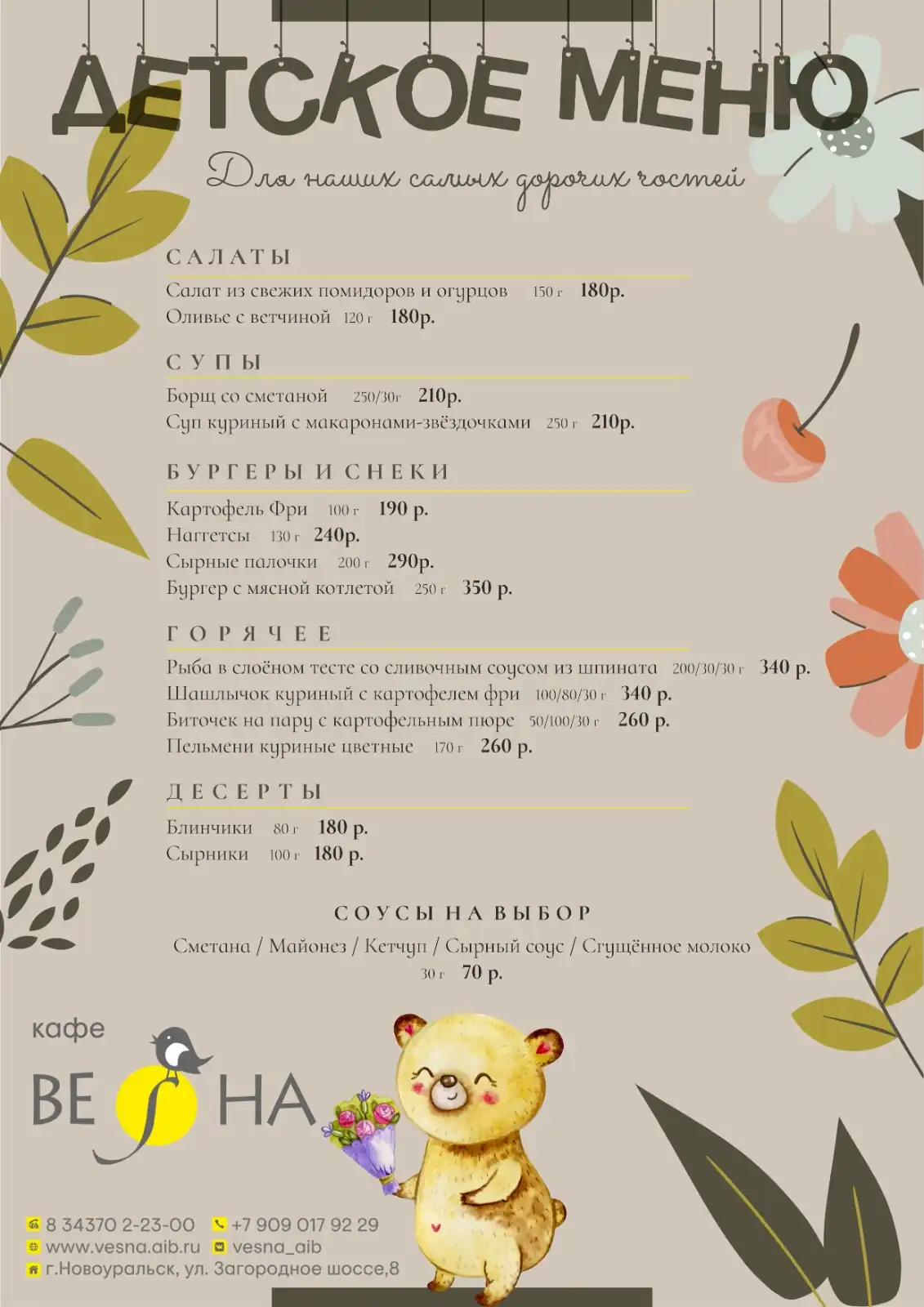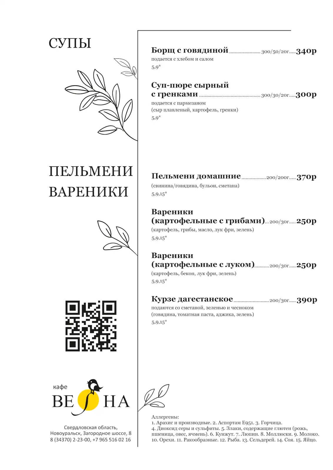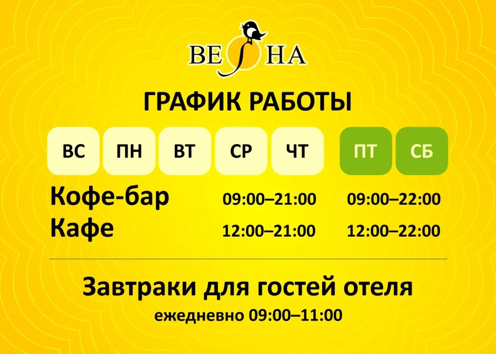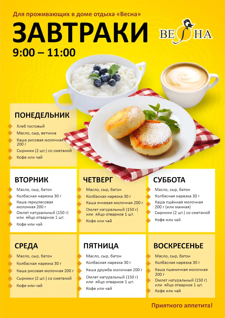 Дом отдыха «Весна» предлагает отведать разнообразные блюда в своем кафе. Здесь можно выбрать подходящее место для романтического ужина или для проведения деловых переговоров.